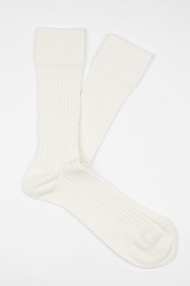 We are therefore extremely proud of our collection of essential socks, which includes this pair of classic and timeless ribbed socks in off-white. Produced in the finest Fil d'Écosse cotton in Portugal.