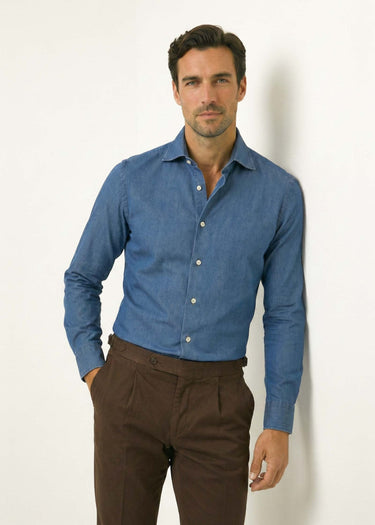 Experience sublime quality in the delicious Denim textile from Italian Albini. The Denim Shirt is made with a nice cut-away collar with the right fit and rounded cuffs. The mid blue washed Denim textile gives the shirt a nice and elegant look.