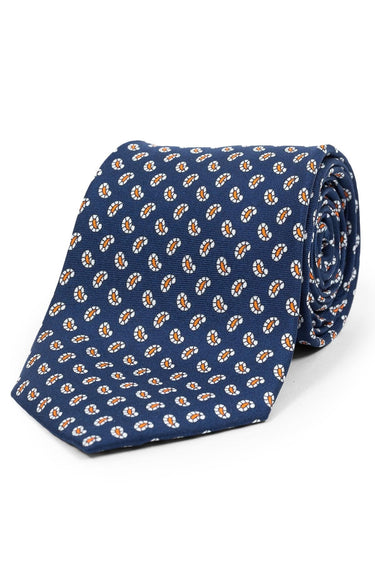 'The Navy Orange Printed Counselor' is made of 100% silk in a navy base color which is combined with elegant white/orange paisleys. It will look cool with most suits, and we recommend teaming the tie with a crisp white shirt to create a timeless look.