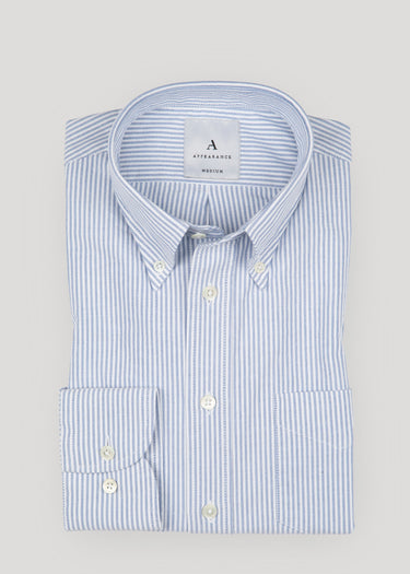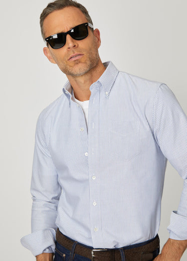 Our blue striped Oxford shirt is made with extra long staple Pima cotton, one of the finest cottons in the world. Unlike regular cotton, Pima cotton is a finer type of cotton that is twice as strong, giving the shirt an extra long lifespan.